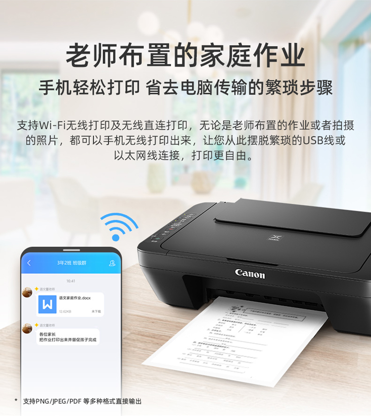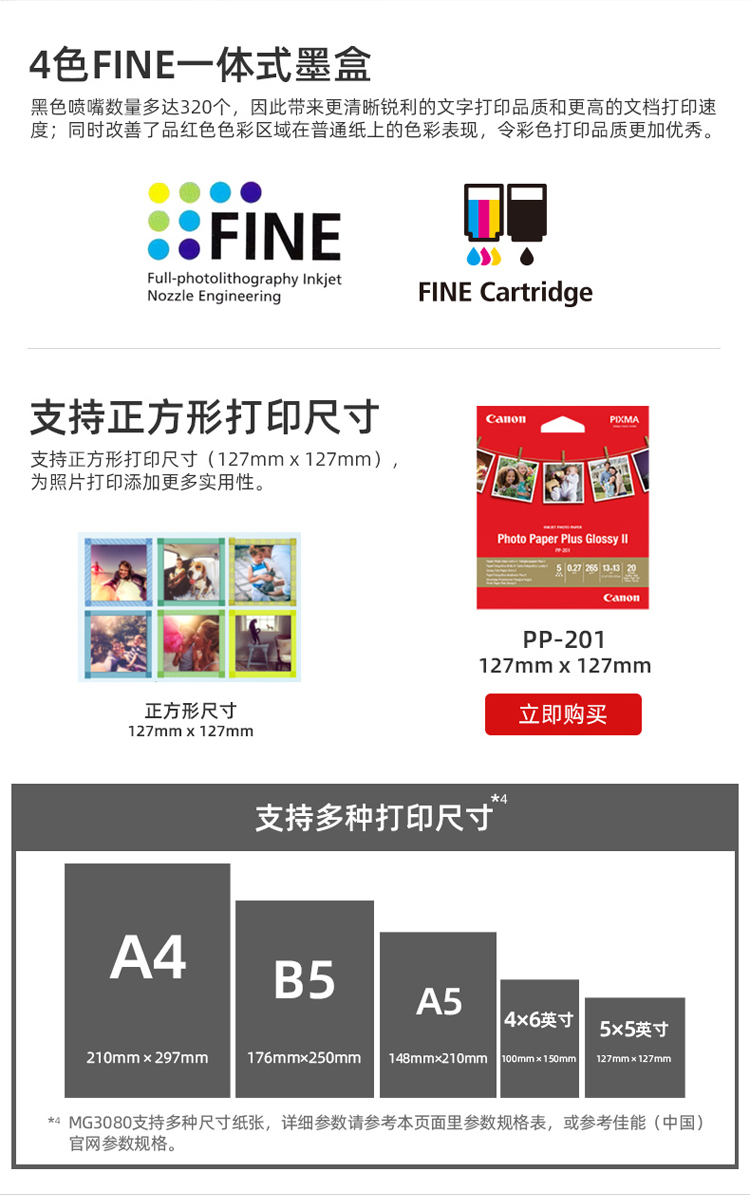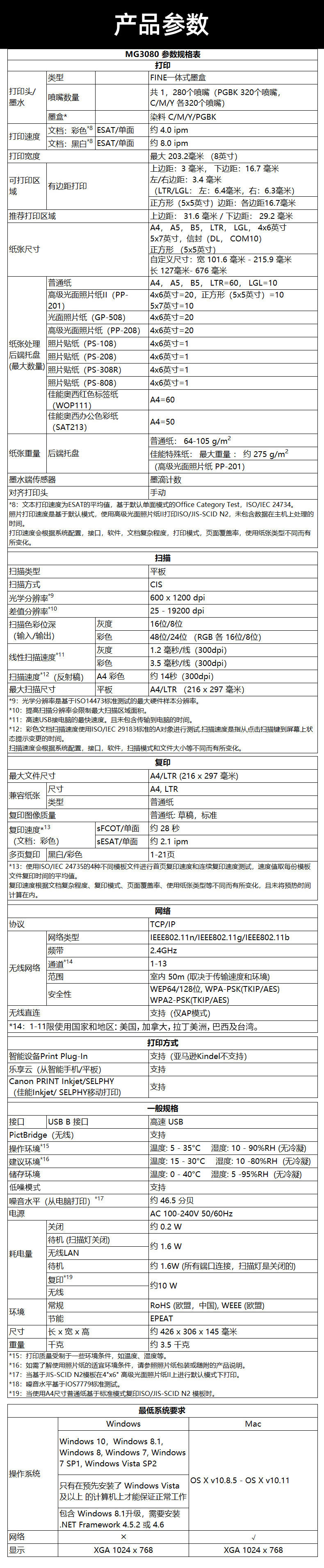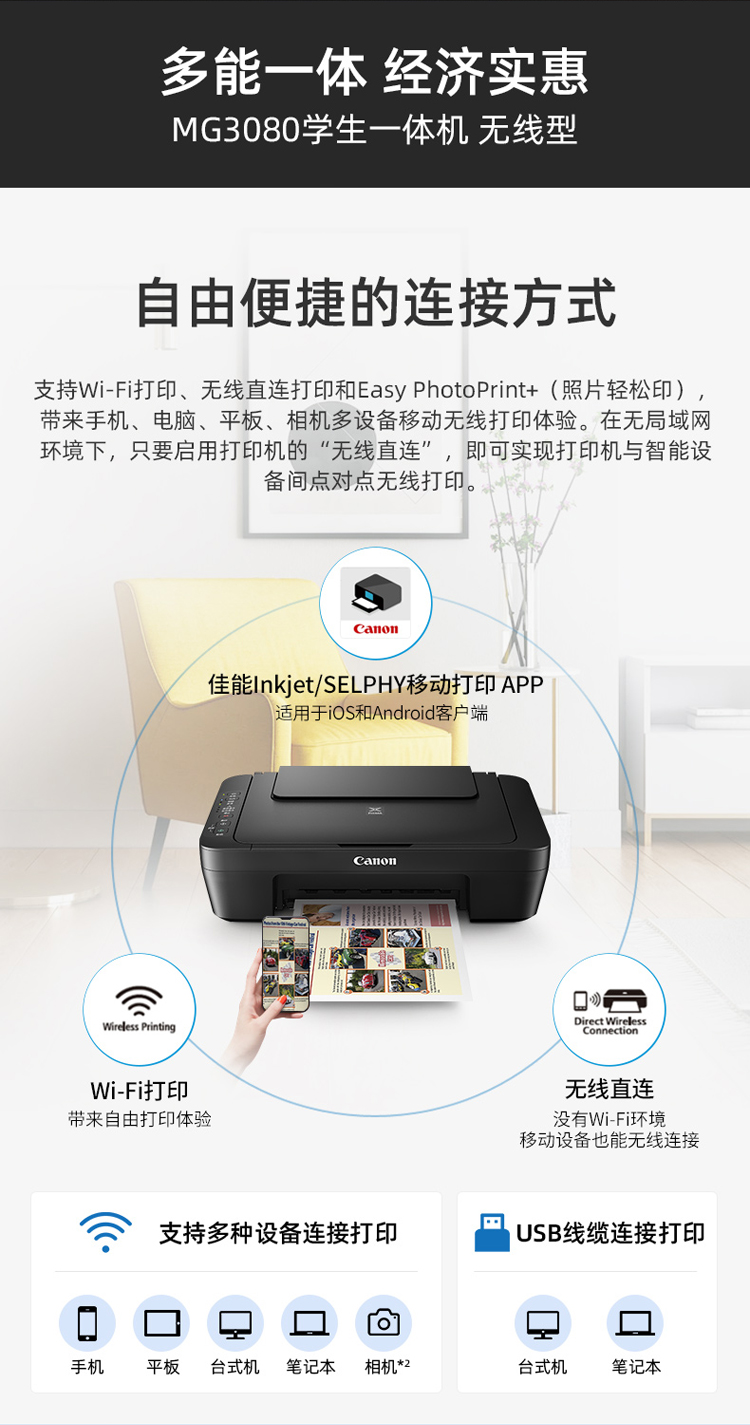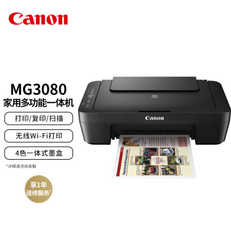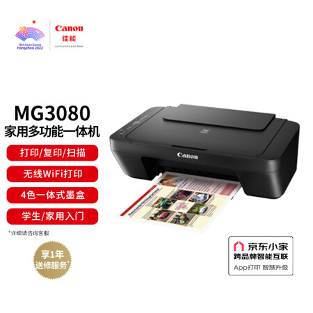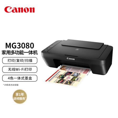 佳能(Canon)MG3080无线家用彩色喷墨多功能一体机(打印/复印/扫描 学生打印/家庭打印/照片打印 WiFi)