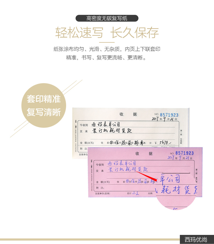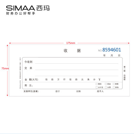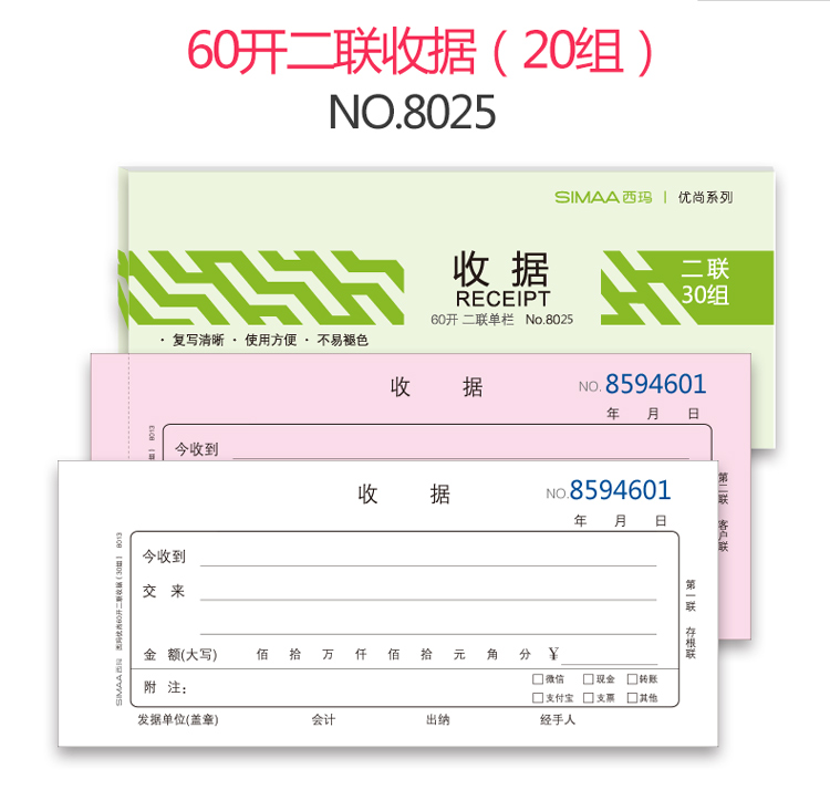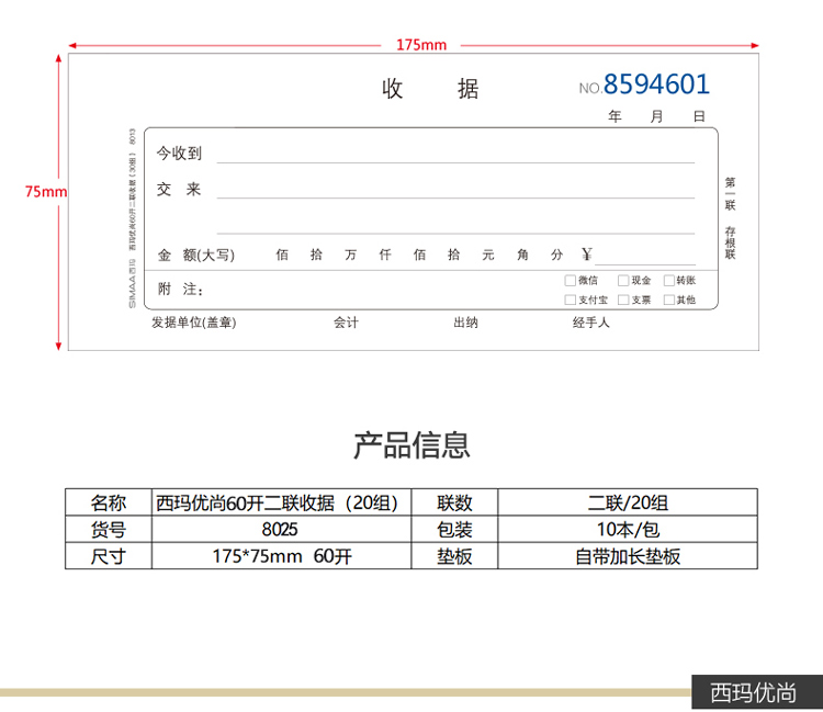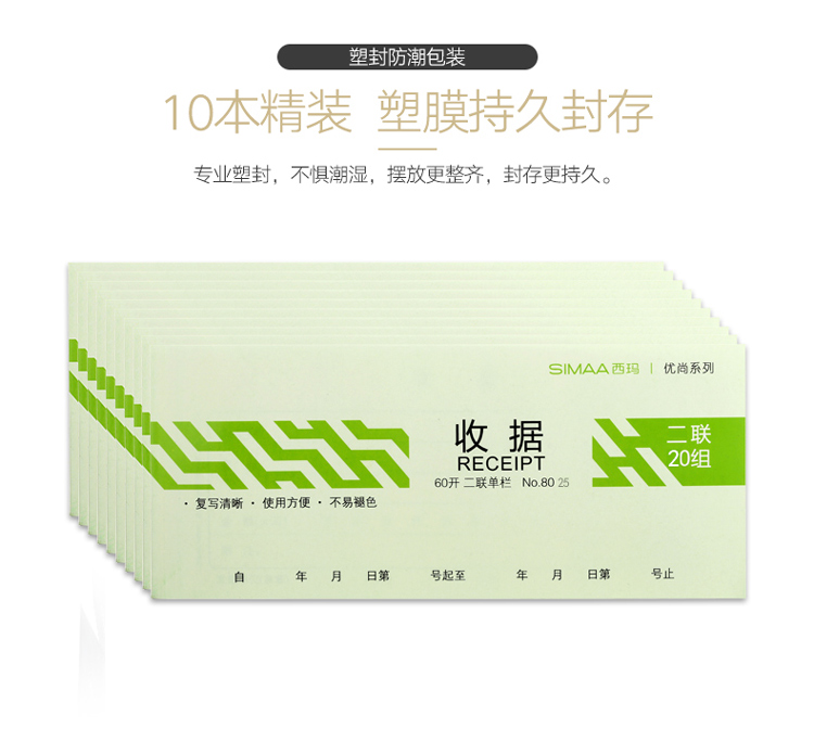 西玛(SIMAA)8025 二联单栏收据 20组10本装 60k 175*75mm 优尚精品 无碳复写收货财务收款凭证单据本